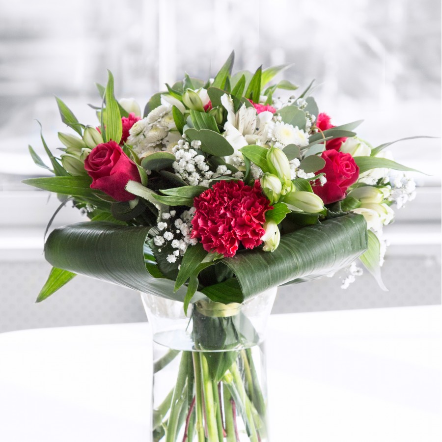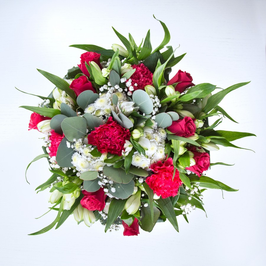 Immerse yourself in the stunning beauty and unique charm of our Luxe Red & White Bouquet. This exquisite arrangement blends the purity of white chrysanthemums and gypsophila with the passionate allure of red roses and carnations. Accented by delicate white alstroemeria and lush aspidistra leaves, each stem is meticulously arranged to create a harmonious and eye-catching display.